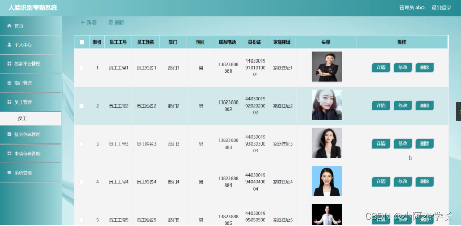 员工管理,在员工管理可以对索引,员工工号,员工姓名,部门,性别,联系电话,身份证,家庭住址,头像等内容进行详情,修改和删除等操作,如图4-7所示。