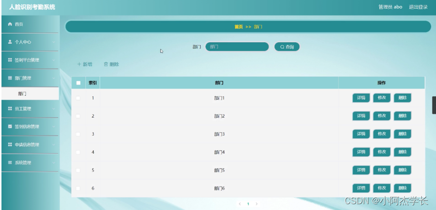部门管理,在部门管理列表可以对索引,部门等内容进行详情,修改和删除操作,如图4-10所示。
