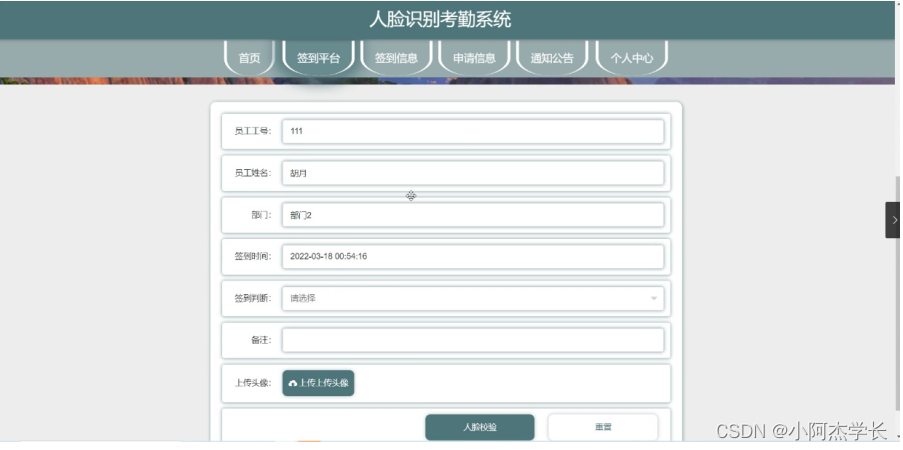 签到平台,在签到平台页面可以详情员工工号,员工姓名,部门,签到时间,签到判断,备注,上传头像等内容,并进行人脸校验证或重置等操作,如图4-3所示。