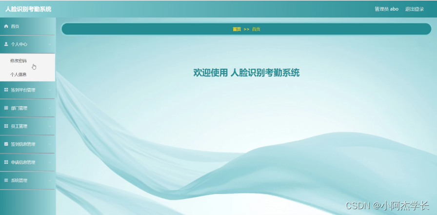 管理员登录系统后,可以对首页,个人中心,签到平台管理,部门管理,员工管理,签到信息管理,申请信息管理,系统管理等功能进行相应的操作管理,如图4-6所示。