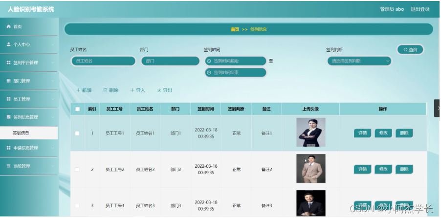 签到信息管理,在签到信息管理列表可以对索引,员工工号,员工姓名,部门,签到时间,签到判断,备注,上传头像等内容进行详情,修改,删除操作,如图4-8所示。