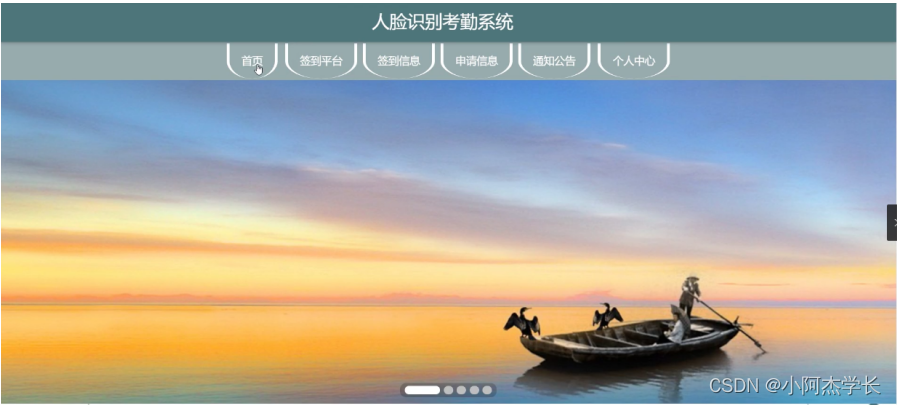 人脸识别考勤系统,在系统首页可以详情首页,签到平台,签到信息,申请信息,通知公告,个人中心等内容,并进行详细操作;如图4-1所示。