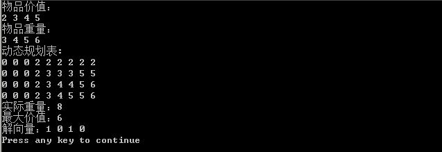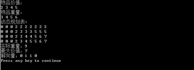 {int i,j;int dpt[n][max_w+1]={0}; //动态规划表int max_v; //最大价值int real_w; //实际重量//--------------第一行------------for (j = 0; j <= max_w; j++)if(j >= weight[0])dpt[0][j] = value[0];//--------------其余行------------for (i = 1; i < n; i++) {for (j = 1; j <= max_w; j++){if (j < weight[i])dpt[i][j] = dpt[i-1][j];else{dpt[i][j] = max(dpt[i-1][j], dpt[i-1][j-weight[i]] + value[i]);}}}//求最大价值 以及实际重量for (j = 1; j <= max_w; j++){if(dpt[n-1][j] > max_v){max_v = dpt[n-1][j];real_w = j;}}//求一个最优解for (i = n-1; i > 0; i--) {if(dpt[i][real_w ] != dpt[i-1][real_w ]){x[i] = 1;real_w = real_w-weight[i];}}if(real_w != 0) x[0] = 1;//返回最大值return max_v;