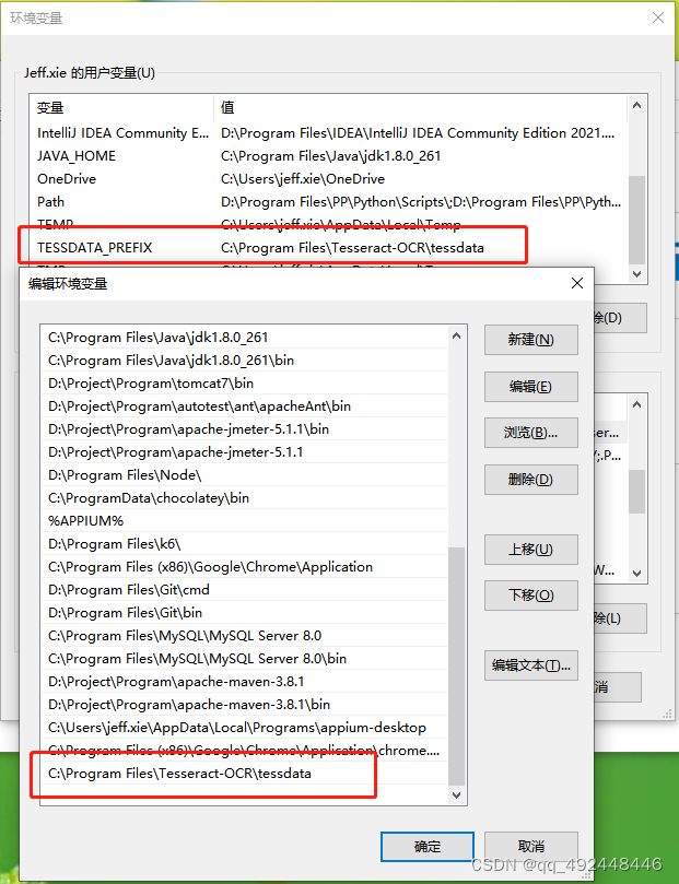 默认情况下Tesseract-OCR是不能识别中文的,需要加载相应的中文语言包,简体中文语言包叫chi_sim.traineddata下载下来之后需要放置到${TESSERACT_HOME}/tessdata目录下,同时把语言包目录路径配置到环境变量当中,新增变量名称为“TESSDATA_PREFIX”。