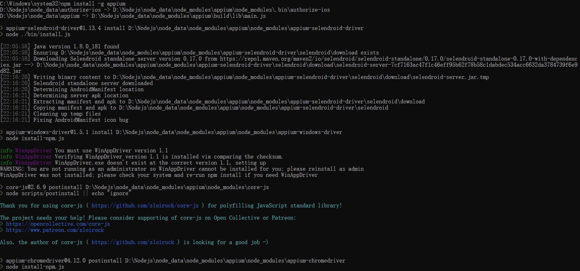 做好的准备工作,下面在cmd(建议以管理员身份运行)中直接运行“nmp install -g appium”即可自动下载安装