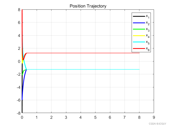 for i=1:timest(:,i+1) = t(:,i) + dT;% 控制输入分别为 atan()Usum(1, i)= A(1,2)*(X(2, i)-sign(A(1,2))*X(1, i)) + A(1,4)*(X(4, i)-sign(A(1,4))*X(1, i)) + A(1,6)*(X(6, i)-sign(A(1,6))*X(1, i));U(1, i) = mu*sign(Usum(1, i))*abs(Usum(1, i))^(2-1/m)+eta*sign(Usum(1, i))*abs(Usum(1, i))^(1/m)+alpha*sign(Usum(1, i)) + 0.1;Usum(2, i)= A(2,1)*(X(2, i)-sign(A(2,1))*X(1, i)) + A(2,3)*(X(3, i)-sign(A(2,3))*X(2, i));U(2, i) = mu*sign(Usum(2, i))*abs(Usum(2, i))^(2-1/m)+eta*sign(Usum(2, i))*abs(Usum(2, i))^(1/m)+alpha*sign(Usum(2, i)) + 0.1;Usum(3, i)= A(3,2)*(X(2, i)-sign(A(3,2))*X(3, i)) + A(3,4)*(X(4, i)-sign(A(3,4))*X(3, i));U(3, i) = mu*sign(Usum(3, i))*abs(Usum(3, i))^(2-1/m)+eta*sign(Usum(3, i))*abs(Usum(3, i))^(1/m)+alpha*sign(Usum(3, i)) + 0.1;Usum(4, i)= A(4,1)*(X(1, i)-sign(A(4,1))*X(4, i)) + A(4,3)*(X(3, i)-sign(A(4,3))*X(4, i)) + A(4,5)*(X(5, i)-sign(A(4,5))*X(4, i));U(4, i) = mu*sign(Usum(4, i))*abs(Usum(4, i))^(2-1/m)+eta*sign(Usum(4, i))*abs(Usum(4, i))^(1/m)+alpha*sign(Usum(4, i)) + 0.1; Usum(5, i)= A(5,4)*(X(4, i)-sign(A(5,4))*X(5, i)) + A(5,6)*(X(6, i)-sign(A(5,6))*X(5, i));U(5, i) = mu*sign(Usum(5, i))*abs(Usum(5, i))^(2-1/m)+eta*sign(Usum(5, i))*abs(Usum(5, i))^(1/m)+alpha*sign(Usum(5, i)) + 0.1;Usum(6, i)= A(6,1)*(X(1, i)-sign(A(6,1))*X(6, i)) + A(6,5)*(X(5, i)-sign(A(6,5))*X(6, i));U(6, i) = mu*sign(Usum(6, i))*abs(Usum(6, i))^(2-1/m)+eta*sign(Usum(6, i))*abs(Usum(6, i))^(1/m)+alpha*sign(Usum(6, i)) + 0.1;X(:,i+1) = X(:,i) + U(:,i)*dT;end%% 绘图