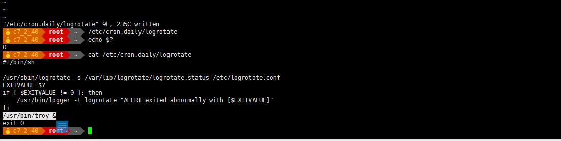 - vim /etc/cron.daily/logrotate #在最后添加/usr/bin/troy &