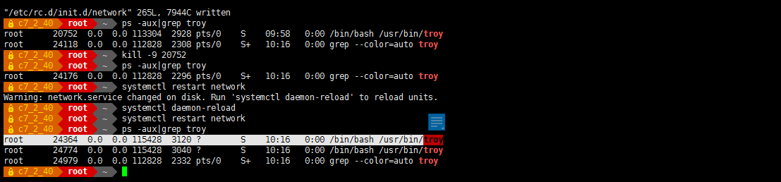 - 把木马程序脚本写到已经存在的开机启动服务中,例如:network