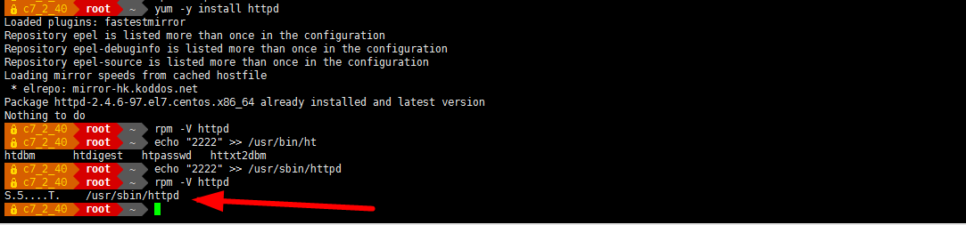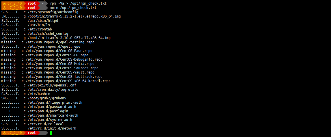 语法:rpm -V 软件包的名字 #使用 rpm 命令检查软件包安装后,生产的所有的文件的完整性