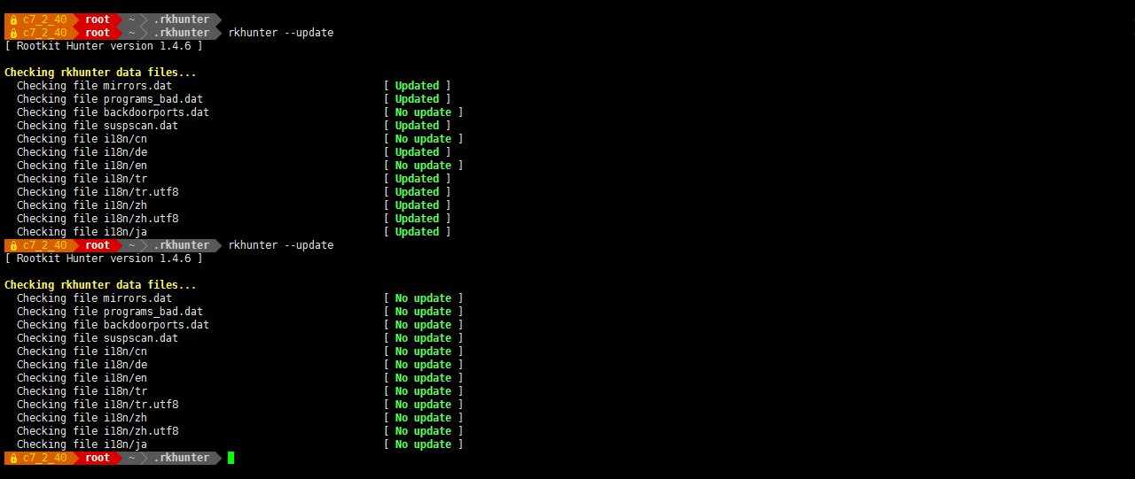 - rkhunter 是通过一个含有 rootkit 名字的数据库来检测系统的 rootkits 漏洞, 所以经常更新该数据库非常重要, 通过下面命令来更新该数据库: