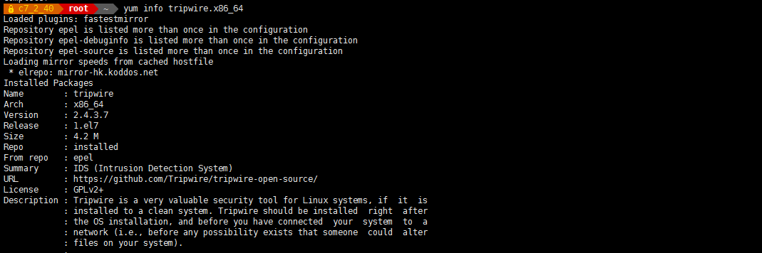Wrote database file: /var/lib/tripwire/c7_2_40.twd # 存储数据的路径及文件名