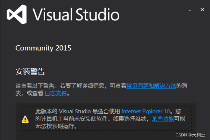 (4)如果你的计算机配置不恰当,VS 安装程序会给出警告。出现该警告是由于我的电脑没有安装 IE10。忽略该警告,点击“继续”按钮。