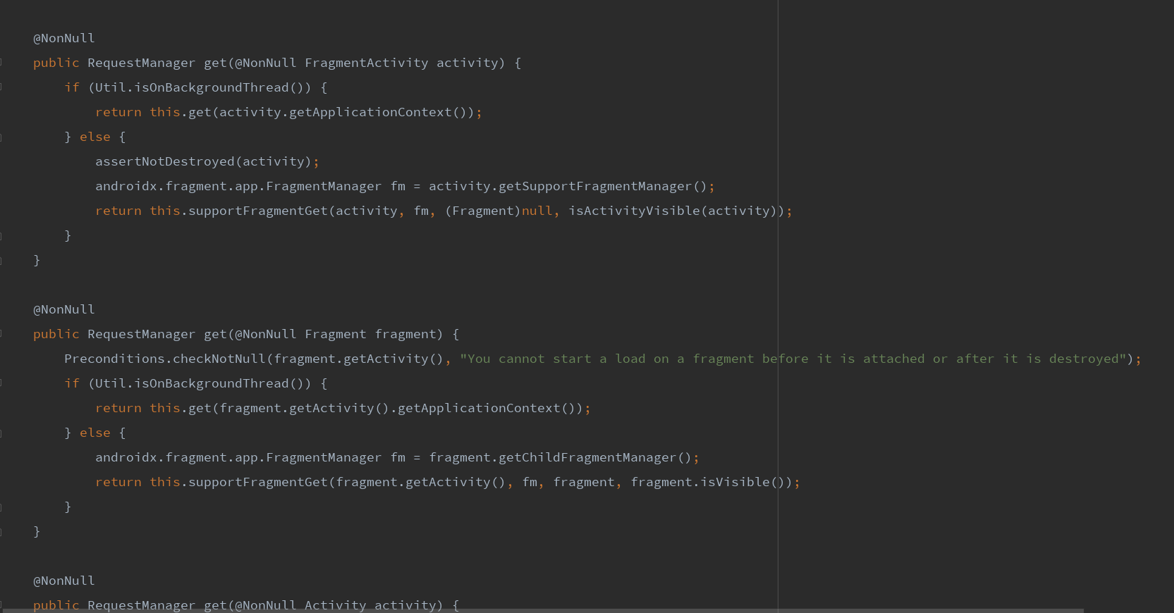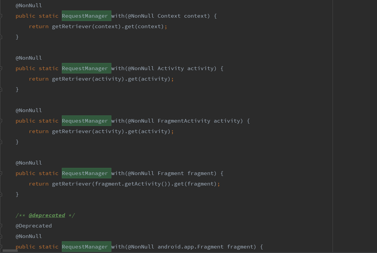 /** @deprecated */@Deprecated@NonNullprivate RequestManager fragmentGet(@NonNull Context context, @NonNull FragmentManager fm, @Nullable android.app.Fragment parentHint, boolean isParentVisible) {RequestManagerFragment current = this.getRequestManagerFragment(fm, parentHint, isParentVisible);RequestManager requestManager = current.getRequestManager();if (requestManager == null) {Glide glide = Glide.get(context);requestManager = this.factory.build(glide, current.getGlideLifecycle(), current.getRequestManagerTreeNode(), context);current.setRequestManager(requestManager);}return requestManager;}
