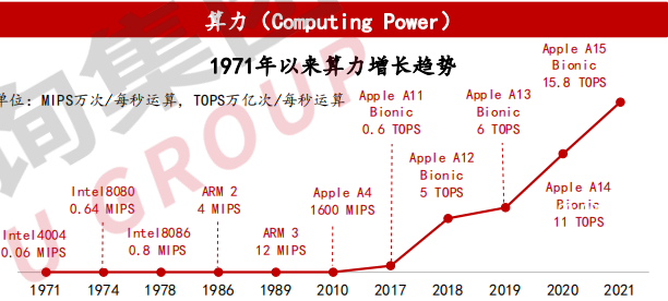 ✈️算力层面:1971年芯片算力从0.06MIPS快速增长15.8TOPS以上