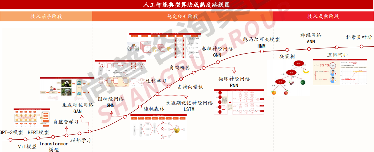 人工智能典型算法历经萌芽期、稳定爬升期和成熟期三个发展阶段。