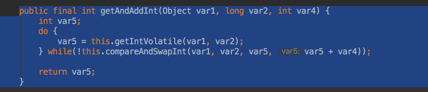 下面是AtomicInteger的compareAndSet调用的底层的UnSafe的getAndAddInt就是采用了自旋锁的机制,