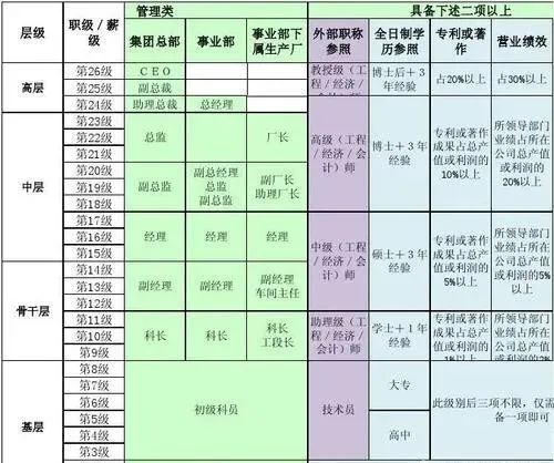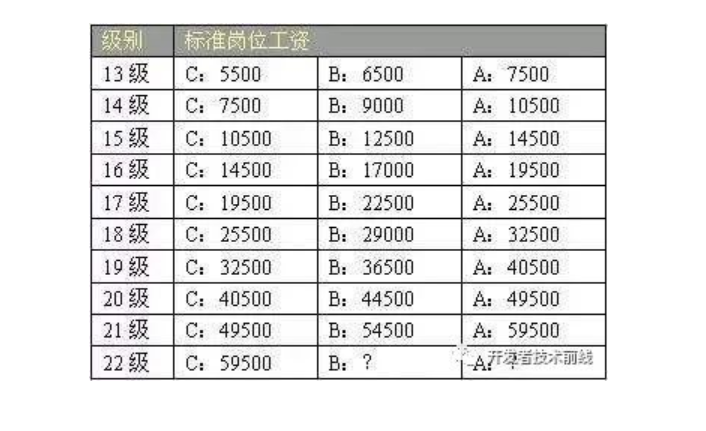 看看华为各级员工的标准岗位工资,我们看到华为将员工分为13~22级,每个级别又分为A、B、C三等,华为一级部门主管或副总裁在22C~21B之间,二级部门总监20A~20C,三级部门主管19A~19C。