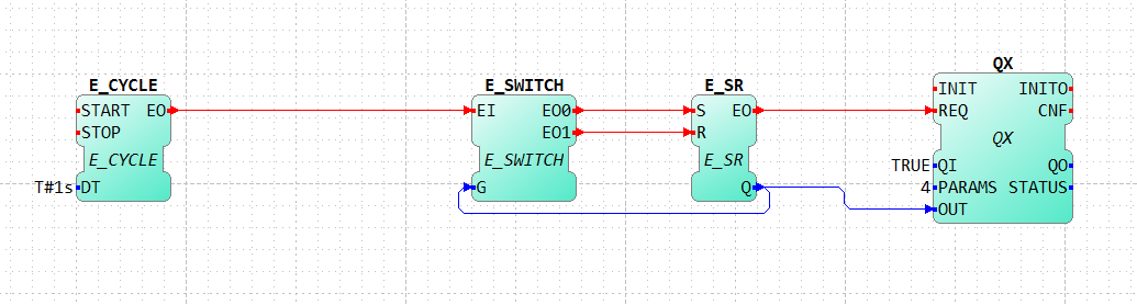 功能块是一个软件的功能单元。它采用图形化表示。通过功能块图形之间的连线,实现一个功能块网络形式的应用程序。下面就是一个LED 闪烁程序的功能块网络。