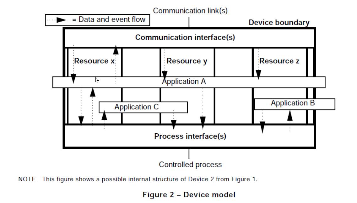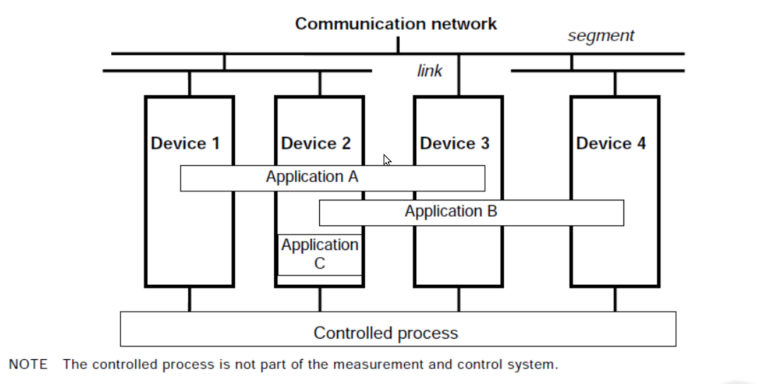 IPMCS 完成的功能在模型中称为应用(Application),它可以驻留在一个设备中,例如应用C 。或者能分布在几个设备中。比如应用A和应用B。比如,一个应用可以由一个或者多个控制环路构成,在这些环中,一个设备采集输入数据,另外一个设备完成过程控制,而输出转换在第三个设备中完成。