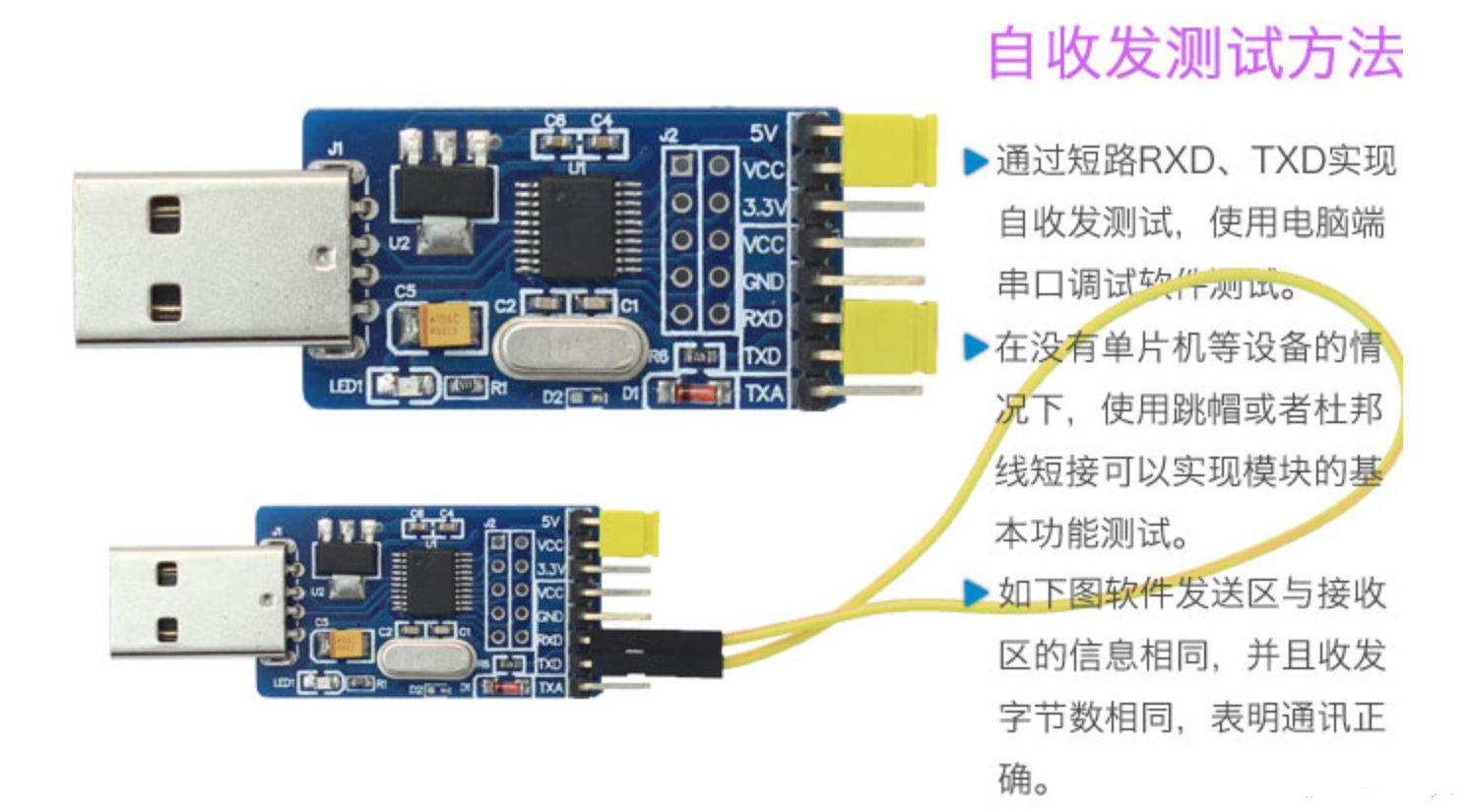 可以对USB转串口模块进行测试,将USB的电压引脚用跳帽接上,然后将RXD和TXD两个引脚用跳帽或者杜邦线接上。