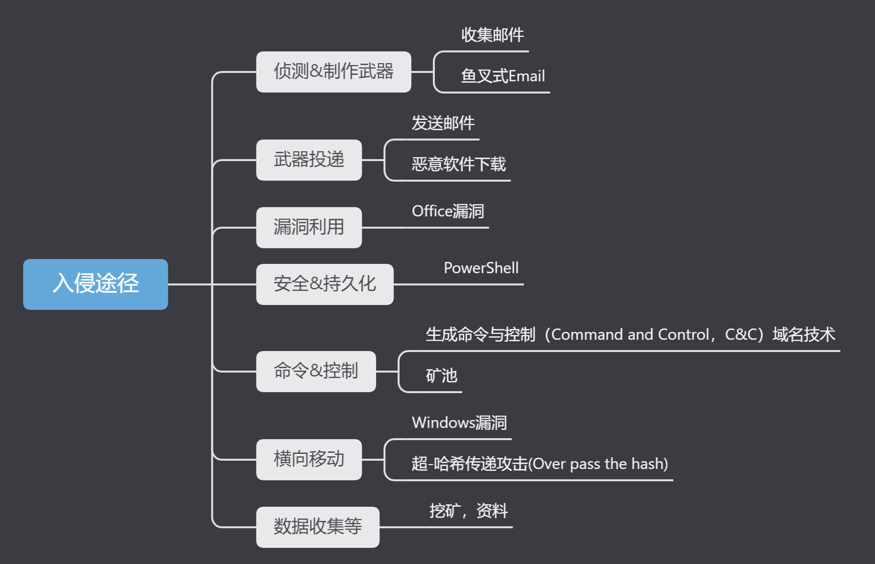 ○指获取内网某台机器的控制权之后,以被攻陷主机为跳板,通过搜集域内凭证,找办法访问到域内其他机器,再依次循环往复,直到获得域控权限甚至控制内网