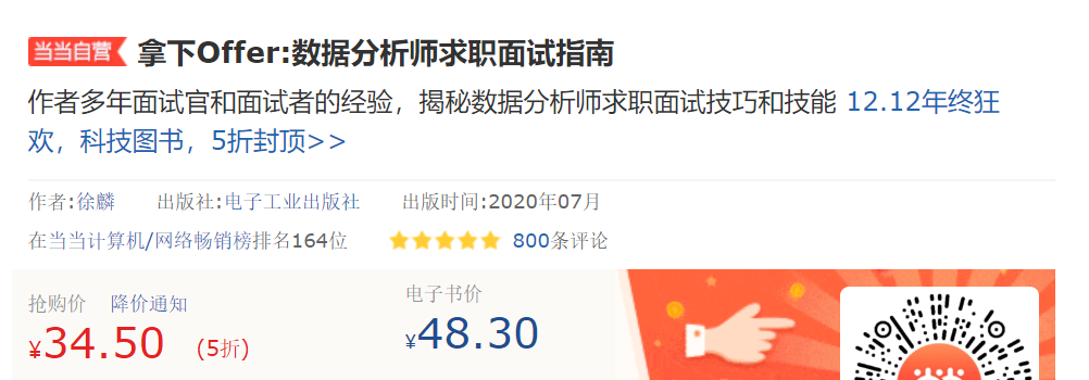 麟哥新书已经在当当上架了,我写了本书:《拿下Offer-数据分析师求职面试指南》,目前当当正在举行双12活动,大家可以用相原价5折的价格购买,还是非常划算的: 数据森麟公众号的交流群已经建立,许多小伙伴已经加入其中,感谢大家的支持。大家可以在群里交流关于数据分析&数据挖掘的相关内容,还没有加入的小伙伴可以扫描下方管理员二维码,进群前一定要关注公众号奥,关注后让管理员帮忙拉进群,期待大家的加入。
