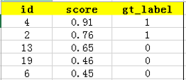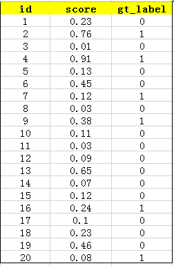 1、首先使用训练好的模型获得所有测试样本的confideutnce score,每个类别(如person、car等)都会获得一组confidence score,假设现在共有20个测试样本,如下给出这20个样本的id、confidence score、真实标签ground truth label。