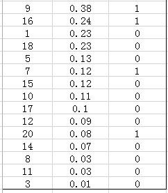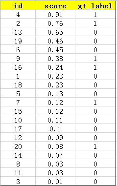 2、按照上图中的score值从大到小对所有样本进行排序,排序后结果如下图所示: