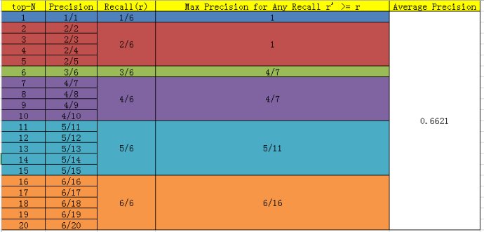 设总数为N的样本中总共有M个正样本,则从Top-1至Top-N可以有M个recall值,分别为(1/M,2/M,...,M/M),对于每个recall值r,可以从对应的(r'>=r)中计算出一个最大的precision,对这M个precision求平均得到AP,如下图所示: