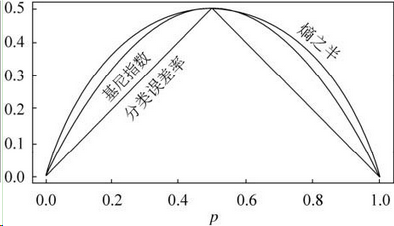 和熵模型的度量方式比,基尼系数对应的误差有多大呢?对于二类分类,基尼系数和熵之半的曲线如下: