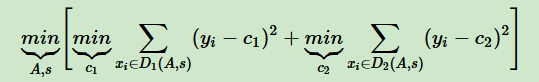 回归模型:采用和方差度量,度量目标是对于划分特征A,对应划分点s两边的数据集D1和D2,求出使D1和D2各自集合的均方差最小,同时D1和D2的均方差之和最小。表达式为: