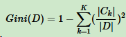 对于样本D,个数为|D|,假设K个类别,第k个类别的数量为|Ck|,则样本D的基尼系数表达式:
