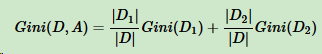 对于样本D,个数为|D|,根据特征A的某个值a,把D分成|D1|和|D2|,则在特征A的条件下,样本D的基尼系数表达式为: