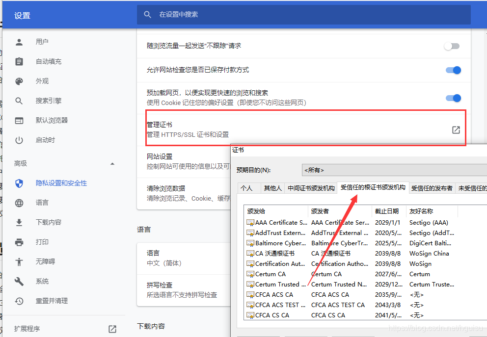 我们可以Google Chrome为例:打开浏览器的设置选项,选择高级,可以看到隐私设置和安全性下面的一些设置,其中管理证书就可以看到谷歌浏览器一些内置证书,如图: