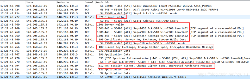 从Server Hello到Server Done,有些服务端的实现是每条单独发送,有服务端实现是合并到一起发送。Sever Hello和Server Done都是只有头没有内容的数据。从抓包图中,数据包是分段发送的: