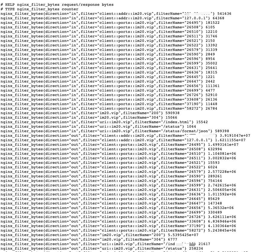 server {listen 80;server_name localhost;vhost_traffic_status_filter_by_set_key $uri uri::$server_name; #每个uri访问量vhost_traffic_status_filter_by_set_key $status $server_name; #http code统计vhost_traffic_status_filter_by_set_key $upstream_addr upstream::backend; #后端转发统计vhost_traffic_status_filter_by_set_key $remote_port client::ports::$server_name; #请求端口统计vhost_traffic_status_filter_by_set_key $remote_addr client::addr::$server_name; #请求IP统计location ~ ^/storage/(.+)/.*$ {set $volume $1;vhost_traffic_status_filter_by_set_key $volume storage::$server_name; #请求路径统计}}