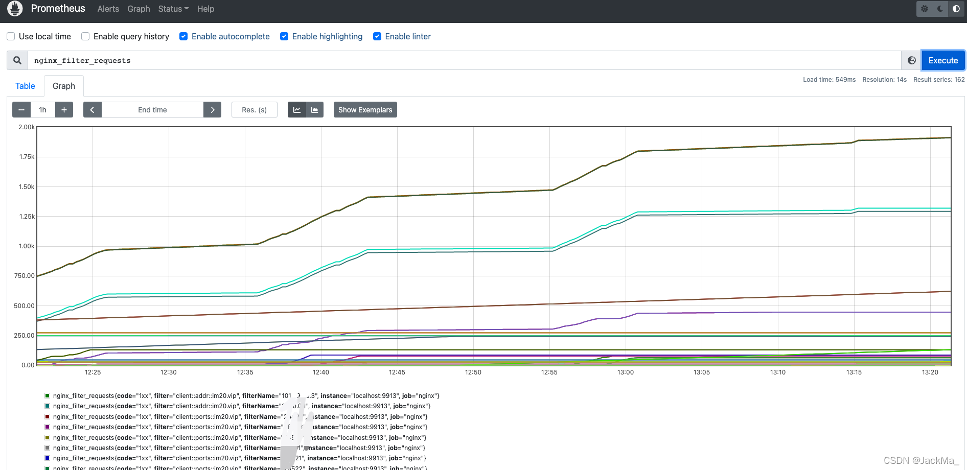 通过以上部署只能拿到默认的指标,生产中可能还会需要监控uri的请求量,监控IP访问情况(同一个IP出现大量访问时可能被攻击),获取不同agent请求量用于分析等,通过vts模块的vhost_traffic_status_filter_by_set_key功能可以自定义需要获取的指标。此处的指标需要加到对应的server配置中.
