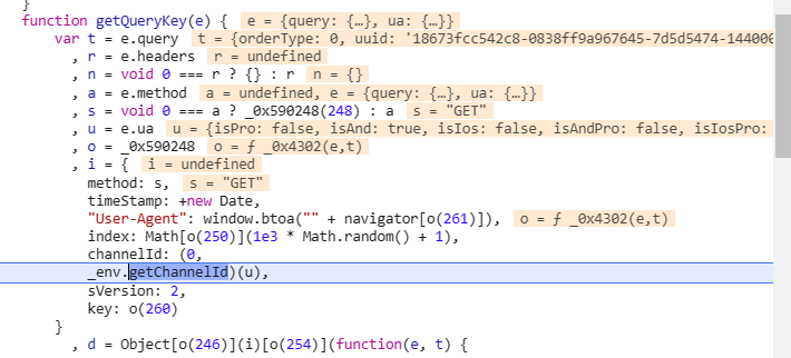 在比较前面的位置,发现了l变量,里面也已经包含了所以参数,我们可以看到l变量是从i变量中取值的,就在代码上方,我们可以看到i变量,里面有一个uuid和getquerykey方法。