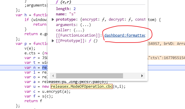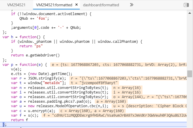 function result(e){function aaa(e) {var n = "ABCDEFGHIJKLMNOPQRSTUVWXYZabcdefghijklmnopqrstuvwxyz0123456789+/";return n.charAt(e)};function uuu(e, r) {if (typeof e === "string") {return e.charCodeAt(r)} else if (e instanceof Array) {return e[r]} else if (e instanceof Uint8Array) {return e[r]}return 0};var gg = function(e) {var r = [];var t = 0;var n = e.length;var i = 0;for (var o = 0; o < n; ++o) {t += 1;if (t === 3) {t = 0}i = uuu(e, o);if (t === 0) {r.push(aaa((uuu(e, o - 1) << 2 | i >> 6) & 63), aaa(i & 63))} else if (t === 1) {r.push(aaa(i >> 2 & 63))} else {r.push(aaa((uuu(e, o - 1) << 4 | i >> 4) & 63))}if (o === n - 1 && t > 0) {r.push(aaa(i << (3 - t << 1) & 63))}}if (t) {while (t < 3) {t += 1;r.push("=")}}return r.join("")};e.cts = (new Date).getTime();var r = JSON.stringify(e);var t = 'jvzempodf8f9anyt';var n = tt(t);var i = tt(t);var o = tt(r);var a = S(o);var u = new s(n,i);var c = u.encrypt(a);var f = gg(c);return f