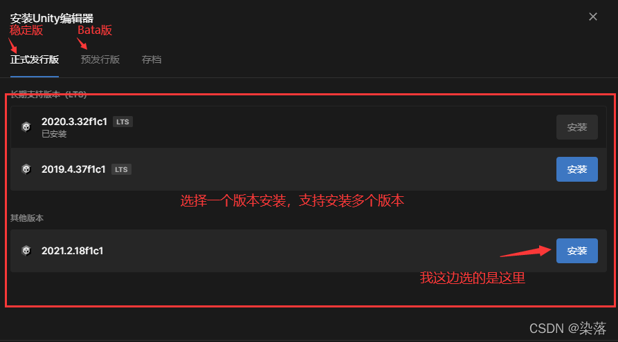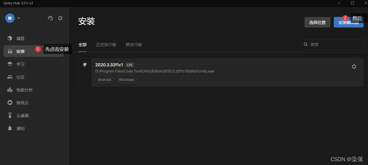 打开安装好的Unity Hub,它会弹出一个安装编程器的提示框,这个基本是稳定版(LTS),可以跳过这个安装选项,自己定制要安装的编辑器和重要工具。