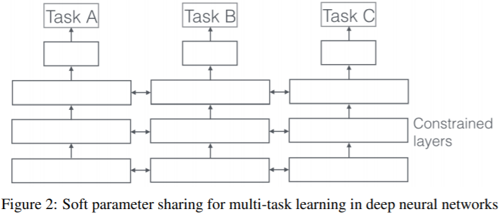 软约束的多任务学习方法是隐藏层参数软共享,不同的任务使用不同的网络,但是不同任务的网络参数,采用正则化作为约束,与硬约束的多任务学习不同的是,底层的参数不一定完全一致,而是鼓励参数相似化。