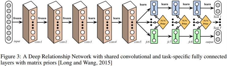(1). Deep Relation Networks:如下图所示:计算机视觉中,MTL通常共享卷积层,同时用全连接层学习特定的任务。通过对任务层设定先验,使模型学习任务间的关系。