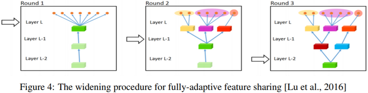 (2). Fully-Adaptive Feature Sharing:如下图所示:一种自下而上的方法,从瘦网络开始,贪心地动态加宽网络。贪心方法可能无法做到全局最优。