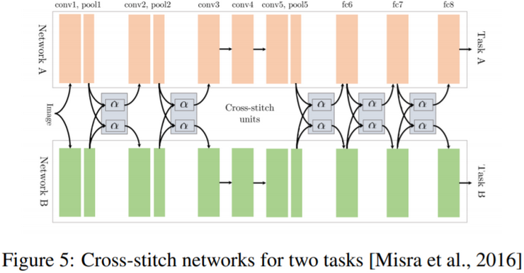 (3). Cross-stitch Networks:如下图所示:用软约束的方式将两个独立的网络连接起来,然后使用”cross-stitch units”允许模型通过线性组合学习前一层的输出。