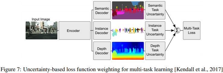 (6). Weighting losses with uncertainty:如下图所示:不考虑学习共享结构,采用正交方法考虑每个任务的不确定性。通过基于具有任务相关不确定性的高斯似然性最大化得出多任务损失函数(loss function),来调整成本函数(cost function)中每个任务的相对权重。