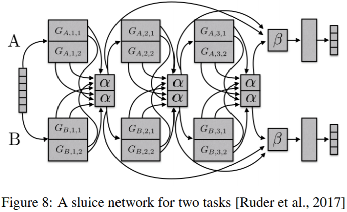 (8). Sluice Networks:如下图所示:该模型概况了基于深度学习的MTL方法:hard parameter sharing + cross-stitch networks + block-sparse regularization + task hierarchy(NLP)