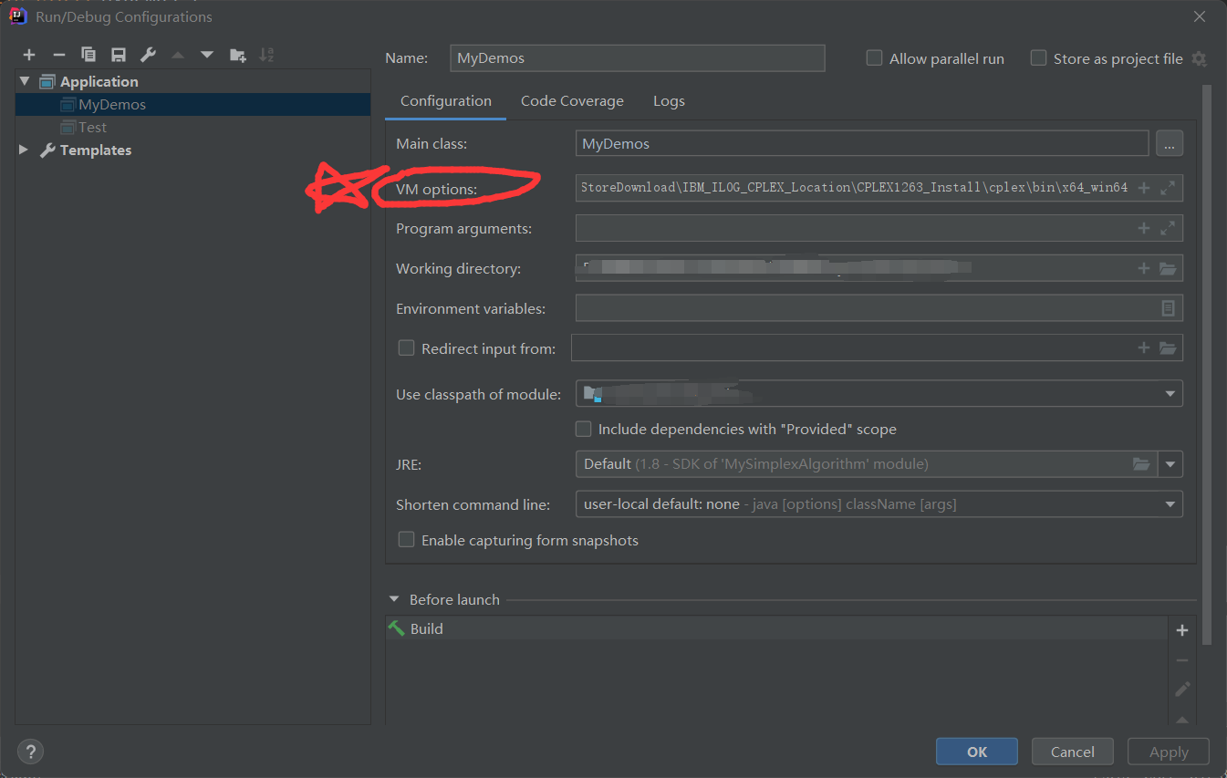 在VM options方框中输入如下命令(每个人的文件夹可能不一样,所以不要直接复制我的命令内容,而是到你自己的CPLEX安装目录中找到x64_win64文件夹路径,然后把我命令中等号后面的内容替换掉就可以了):