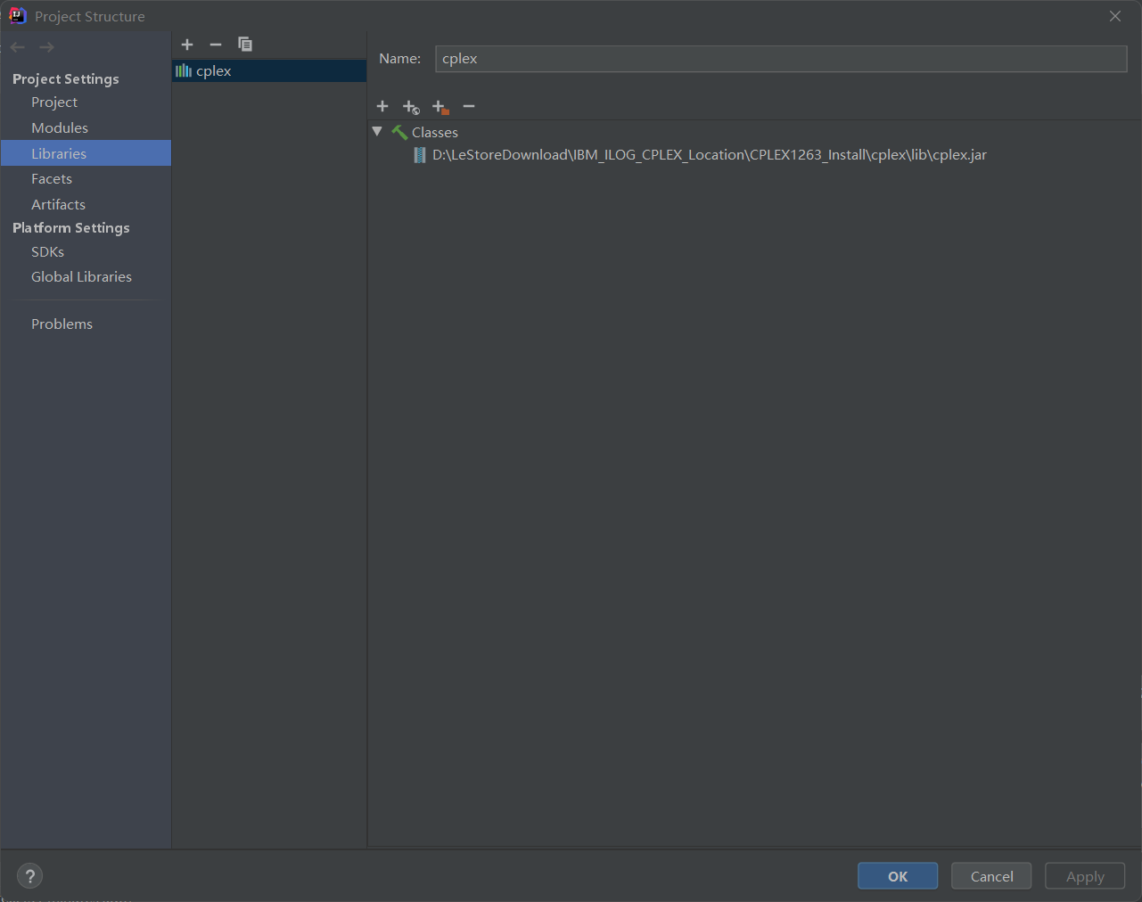 在IDEA页面中新建项目后,依次点击左上角File->Project Structure->Libraries,点击窗口中间菜单栏左上角的“+”号,将上面CPLEX安装目录下cplex文件夹中的lib文件夹下的cplex.jar添加到项目中,点击Apply。