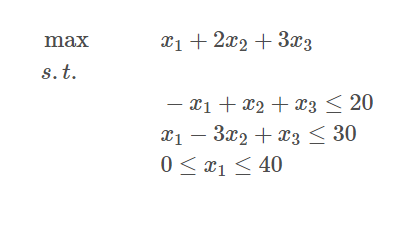 import ilog.cplex.IloCplex;public class MyDemos {public static void main(String[] args){try{IloCplex cplex = new IloCplex(); // creat a modeldouble[] lb = {0.0, 0.0, 0.0};double[] ub = {40.0, Double.MAX_VALUE, Double.MAX_VALUE};IloNumVar[] x = cplex.numVarArray(3, lb, ub);double[] objvals = {1.0, 2.0, 3.0};cplex.addMaximize(cplex.scalProd(x, objvals));double[] coeff1 = {-1.0, 1.0, 1.0};double[] coeff2 = {1.0, -3.0, 1.0};cplex.addLe(cplex.scalProd(x, coeff1), 20.0);cplex.addLe(cplex.scalProd(x, coeff2), 30.0);if (cplex.solve()){cplex.output().println("Solution status = " + cplex.getStatus());cplex.output().println("Solution value = " + cplex.getObjValue());double[] val = cplex.getValues(x);for (int j = 0; j < val.length; j++)cplex.output().println("x" + (j+1) + "  = " + val[j]);}cplex.end();}catch (IloException e){System.err.println("Concert exception caught: " + e);}}