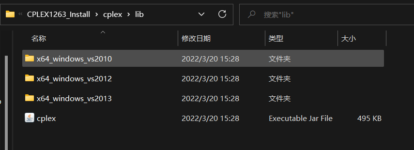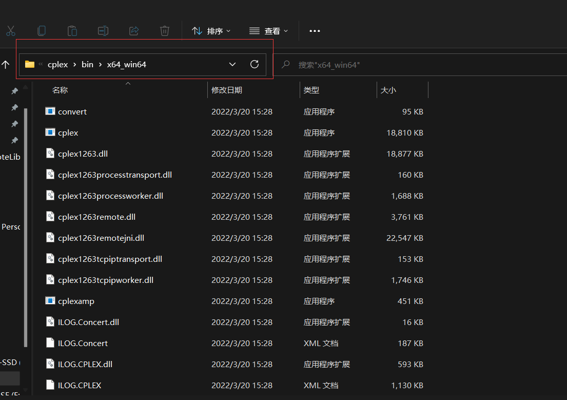 例如:直接在文件管理器中找到CPLEX安装路径下对应的x64_win64文件夹,然后复制下面红色方框中的地址